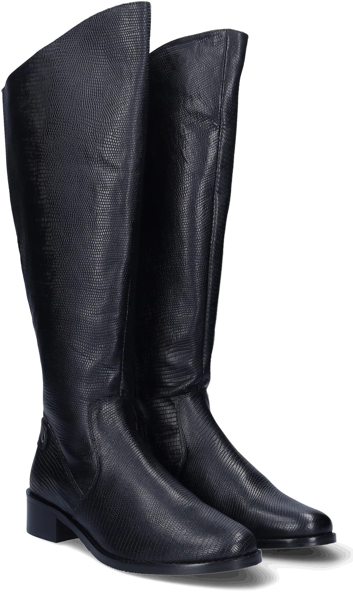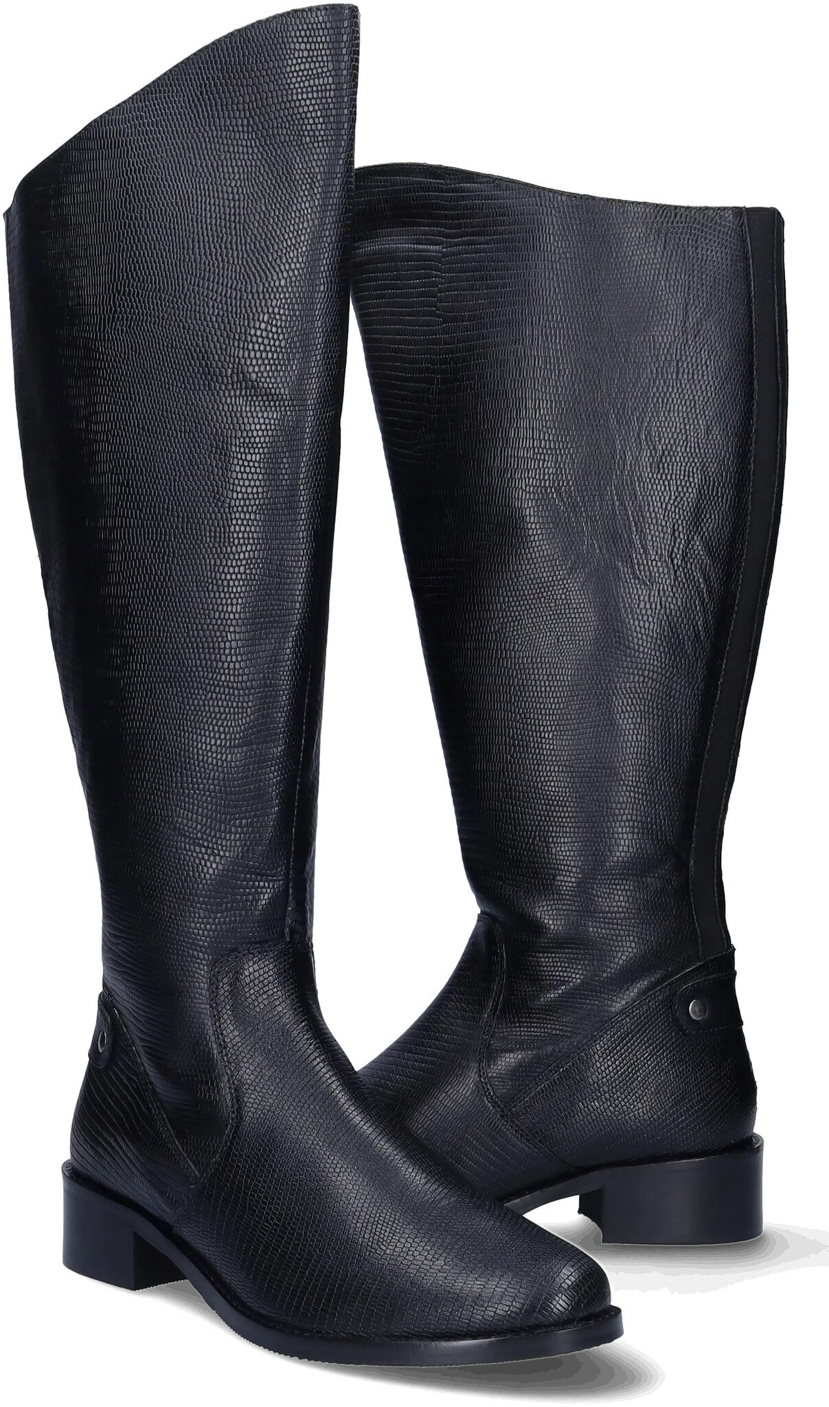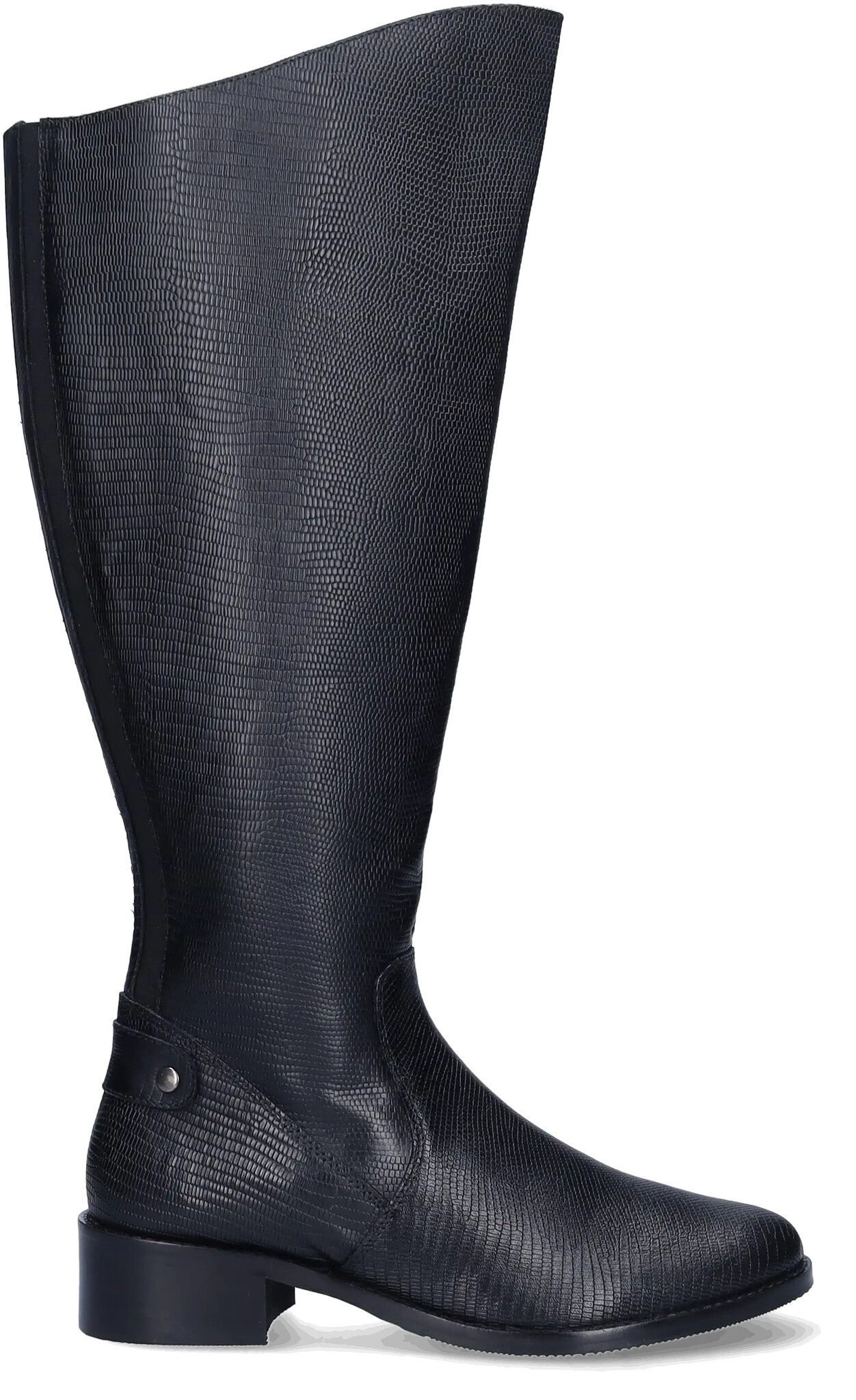 Botta is a black leather, faux snakeskin, riding-style tall extra wide calf boot, with a boldly curved topline that sits just at the knee.