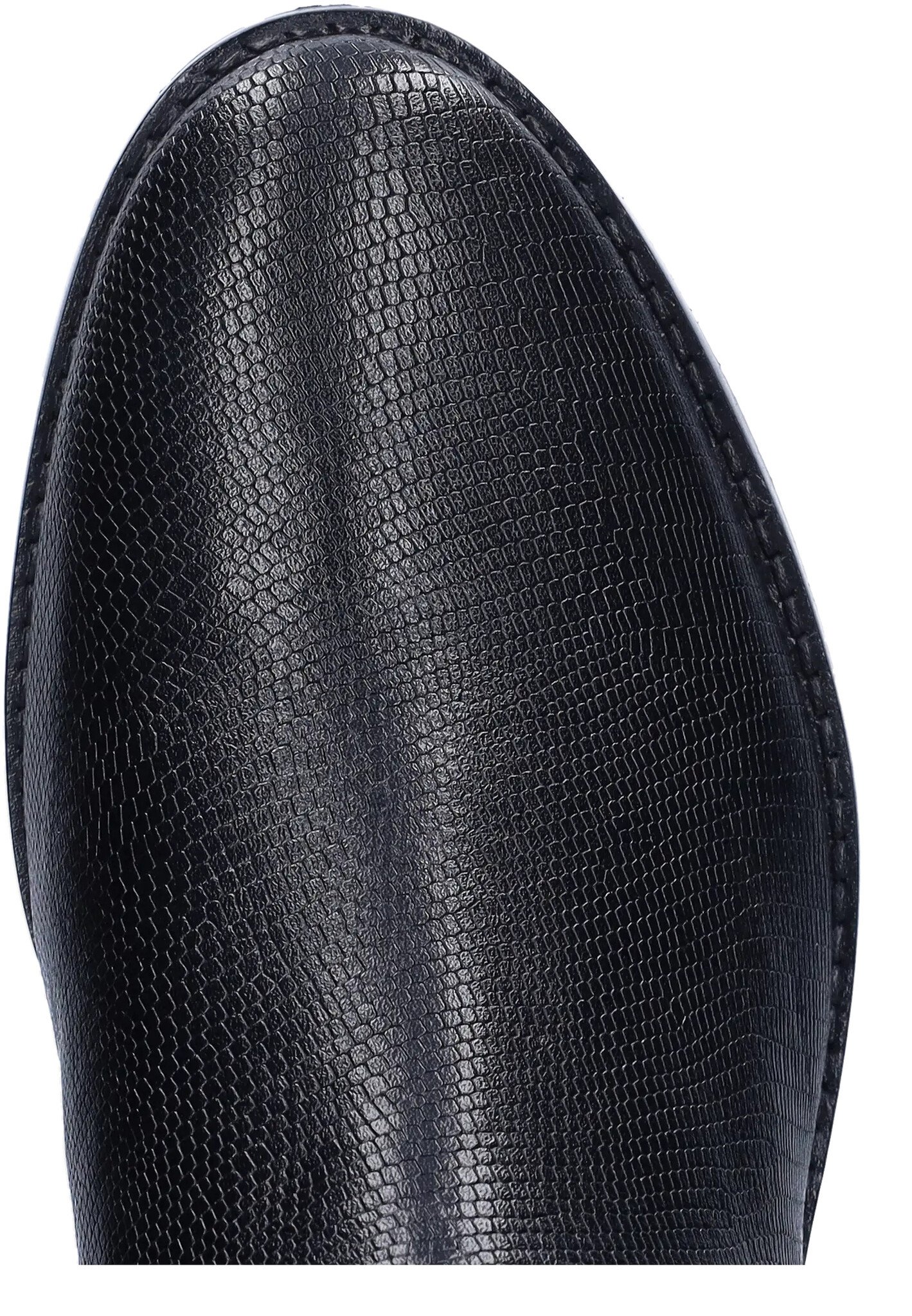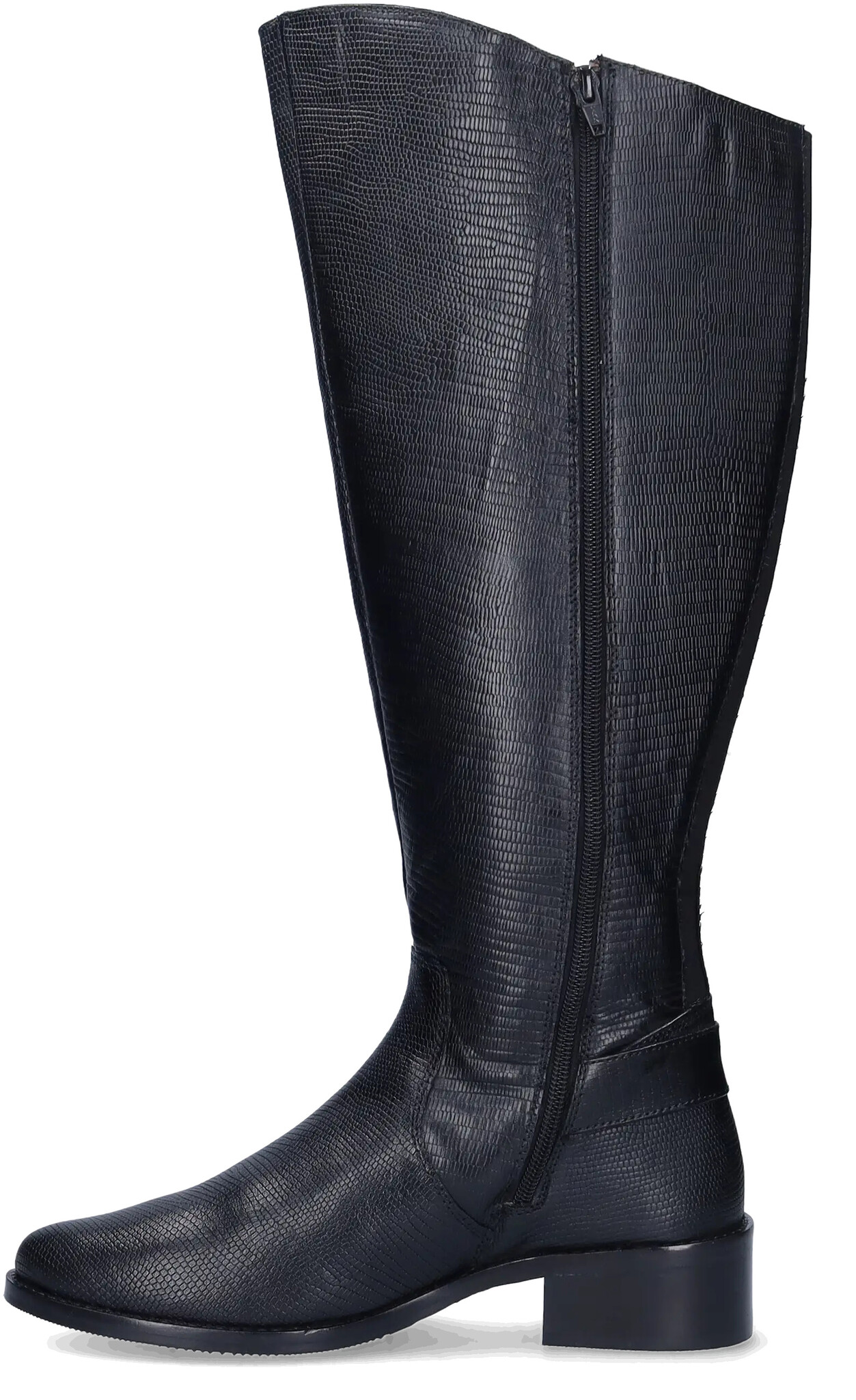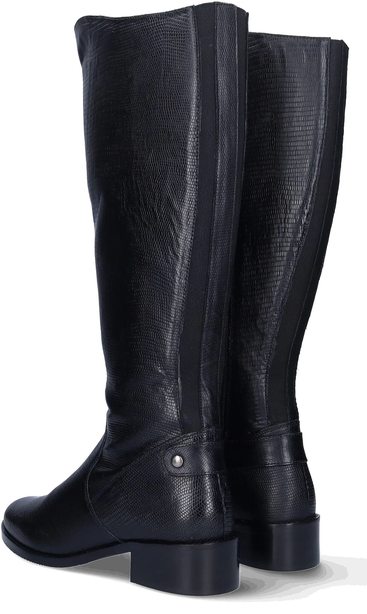 Botta is a black leather, faux snakeskin, riding-style tall extra wide calf boot, with a boldly curved topline that sits just at the knee.
