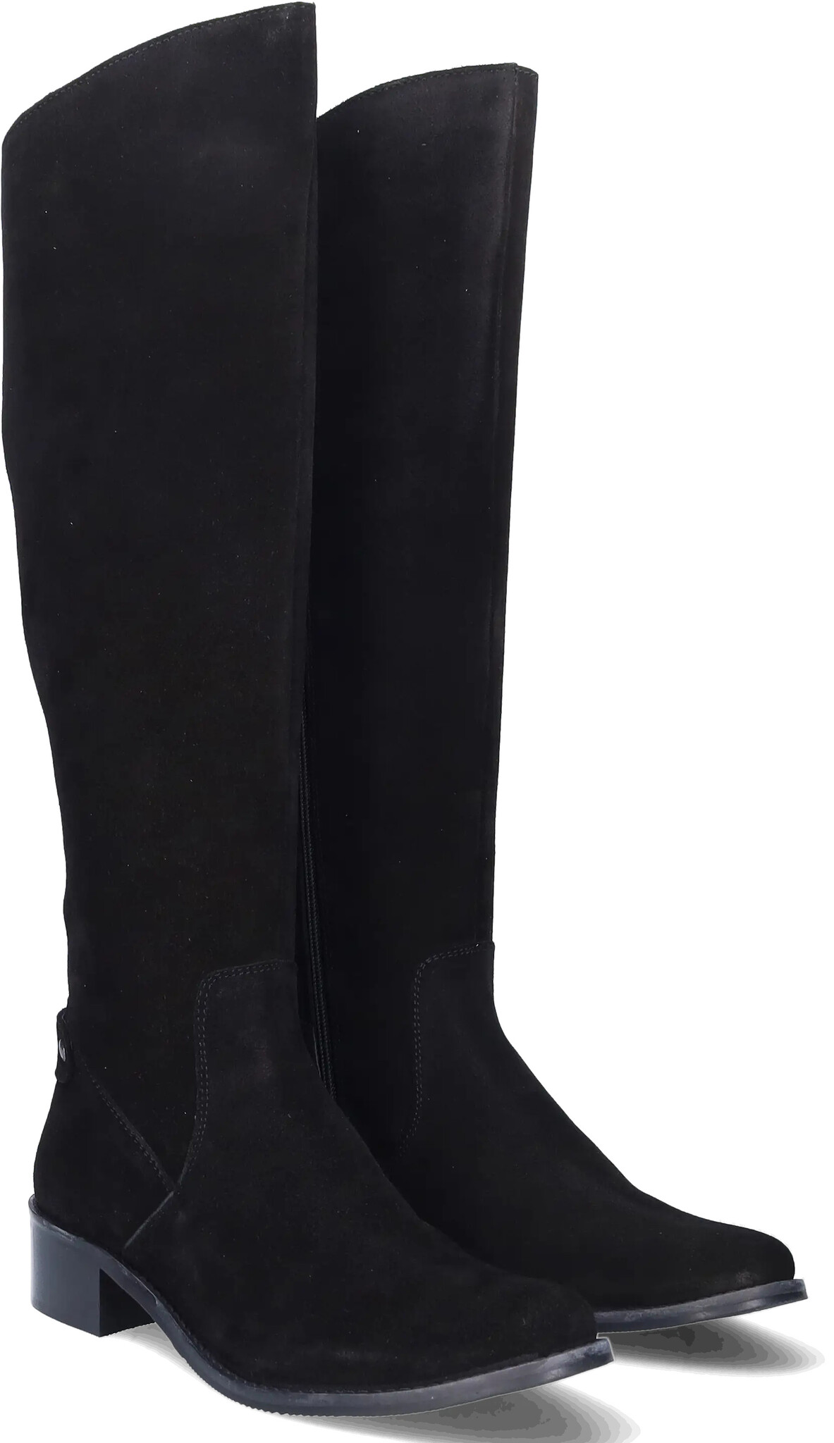 Botta is a subtle black suede, riding-style tall wide calf boot, crafted with a beautifully curved topline that sits just at the knee, creating a striking silhouette reminiscent of classic equestrian design.