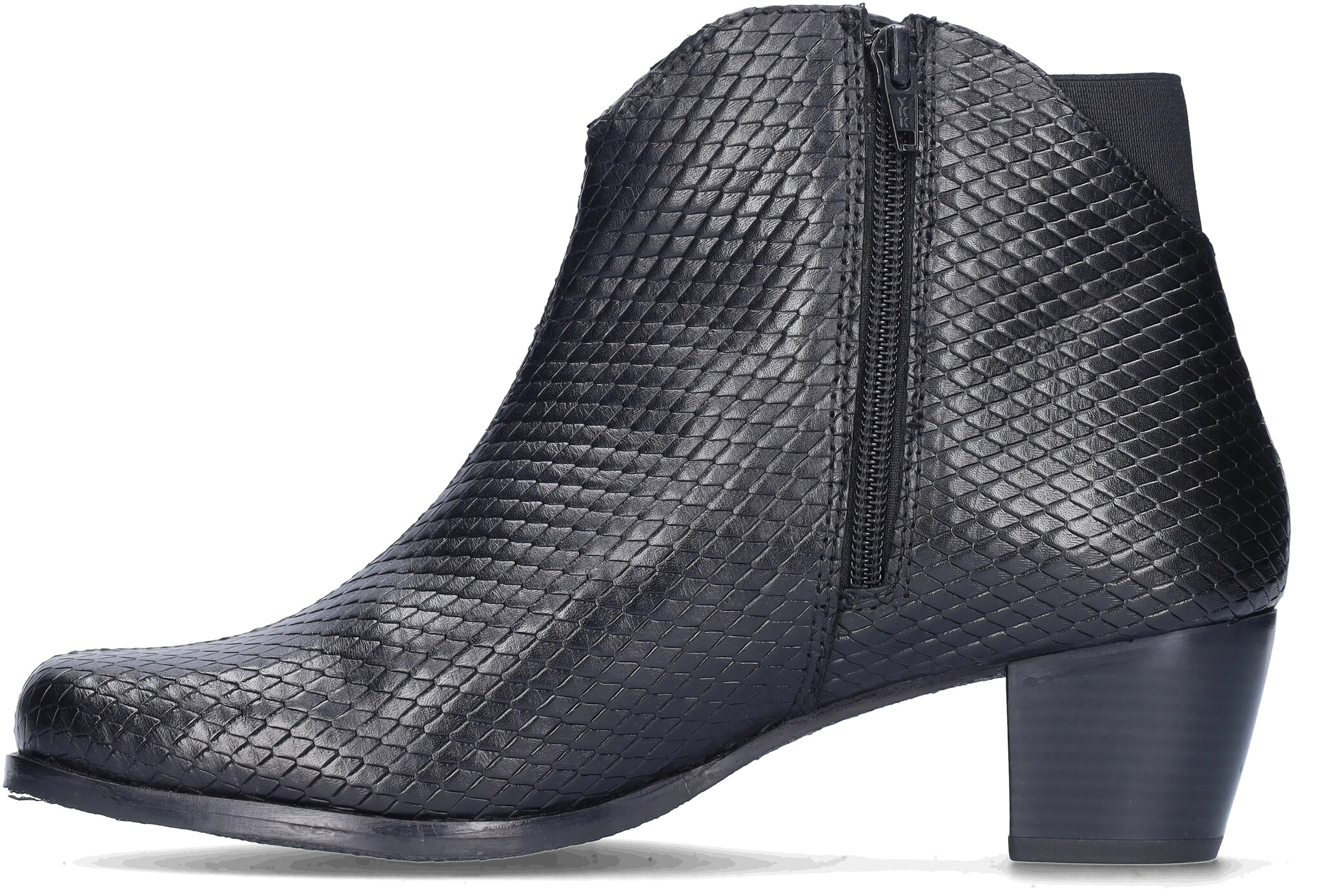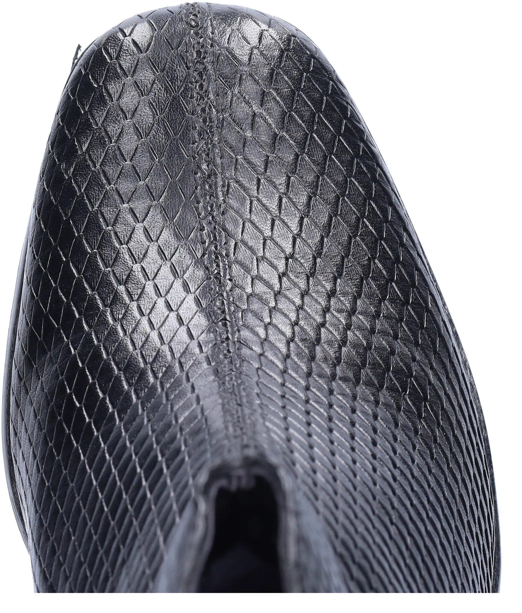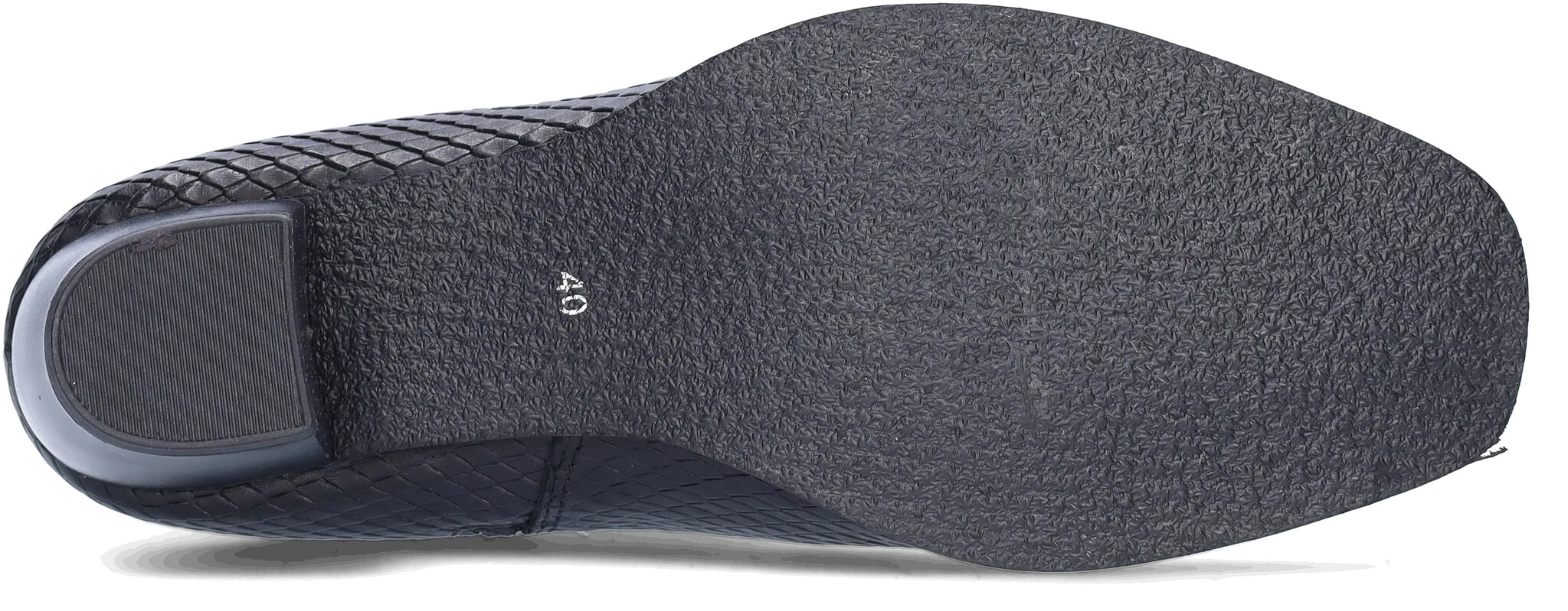 Didcot is a black wide-width leather ankle boot with a quilted pattern, a pointed toe, a high heel, and a side zipper closure.