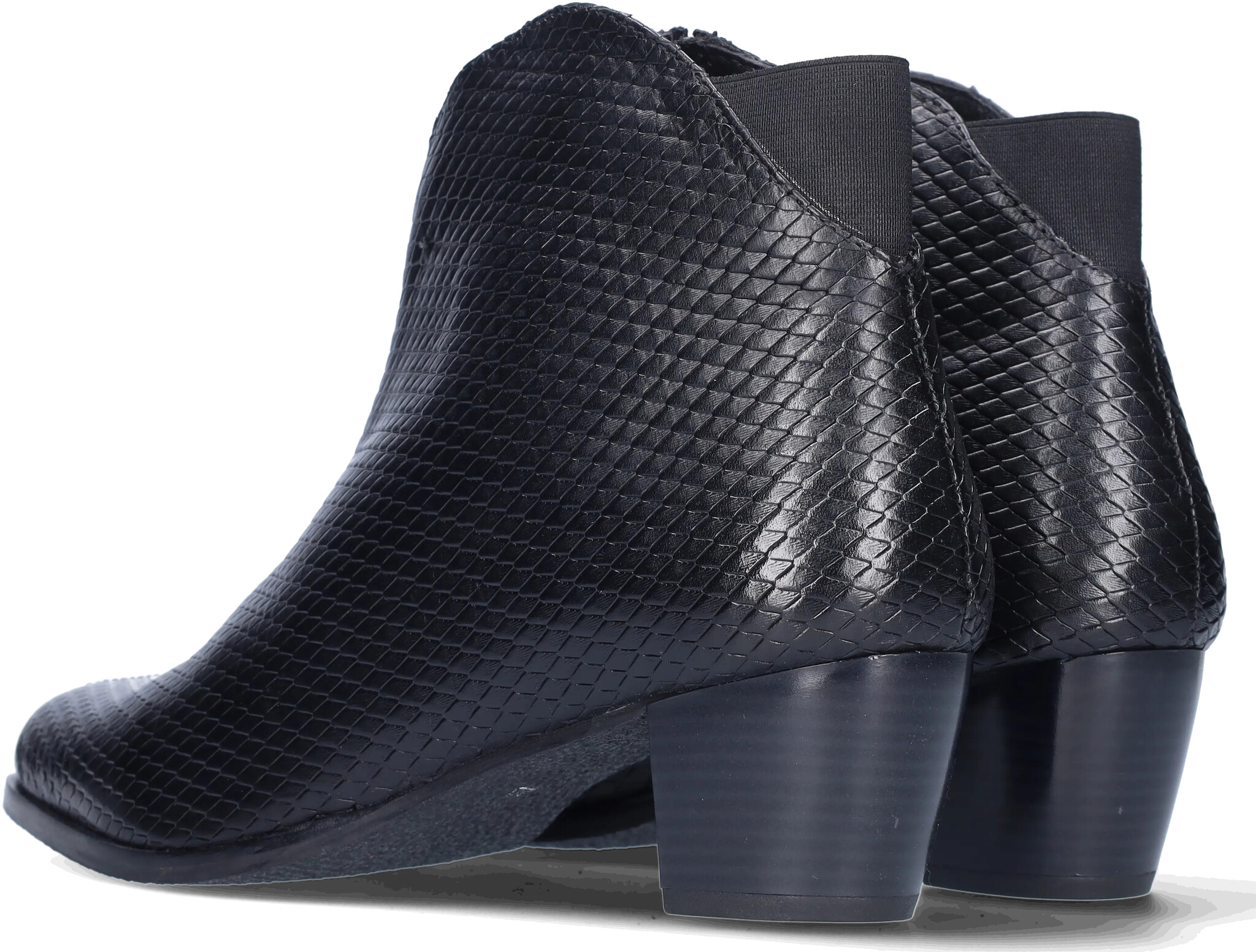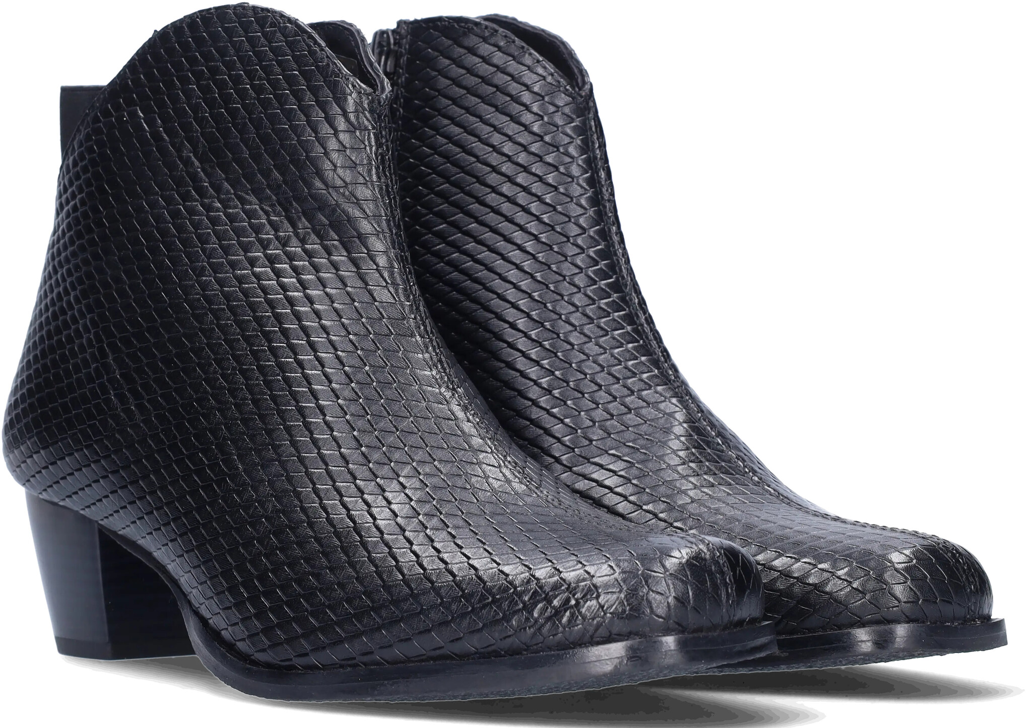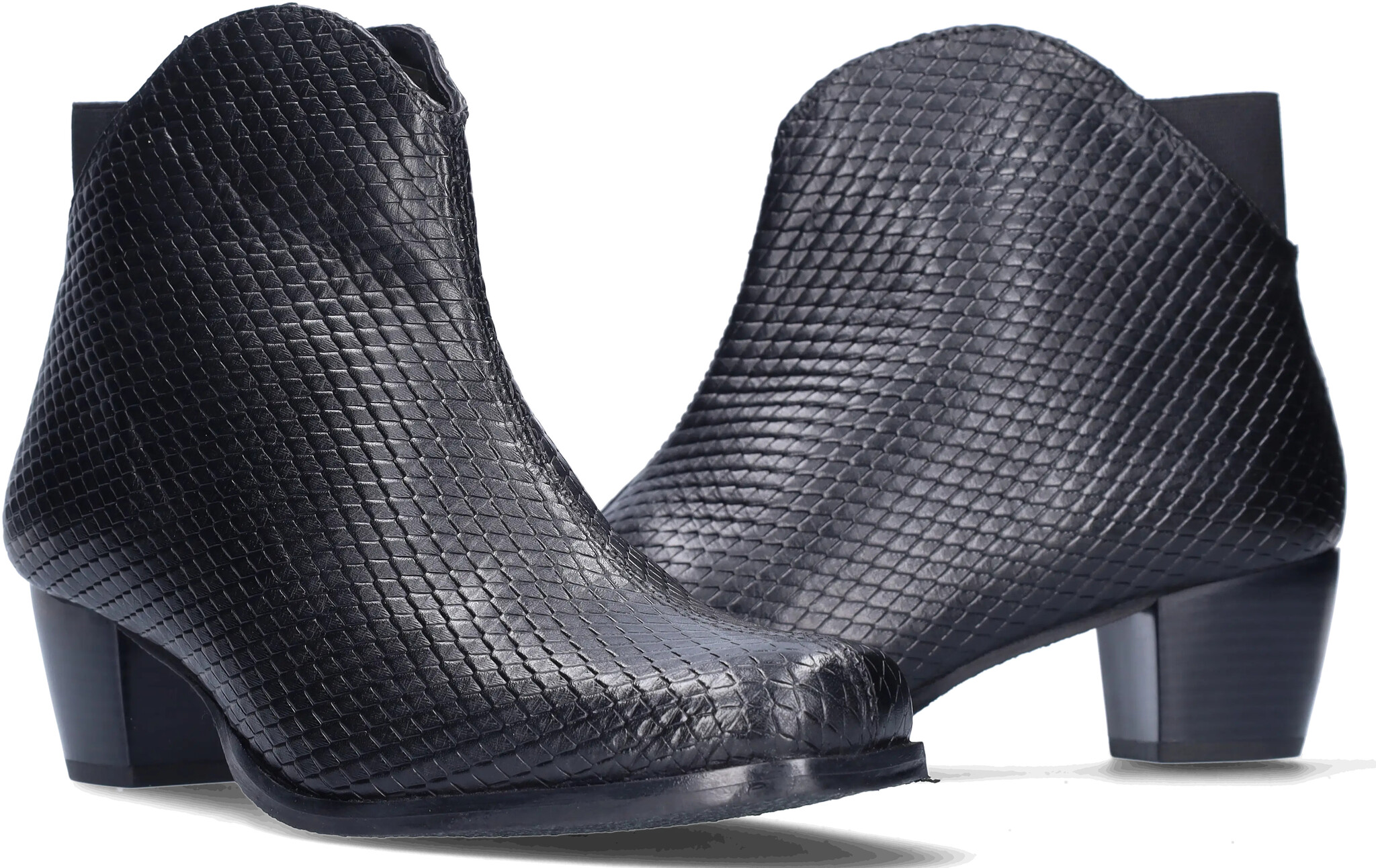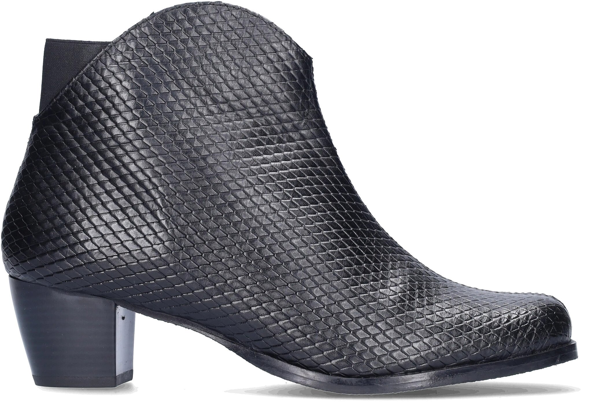 Didcot is a black wide-width leather ankle boot with a quilted pattern, a pointed toe, a high heel, and a side zipper closure.