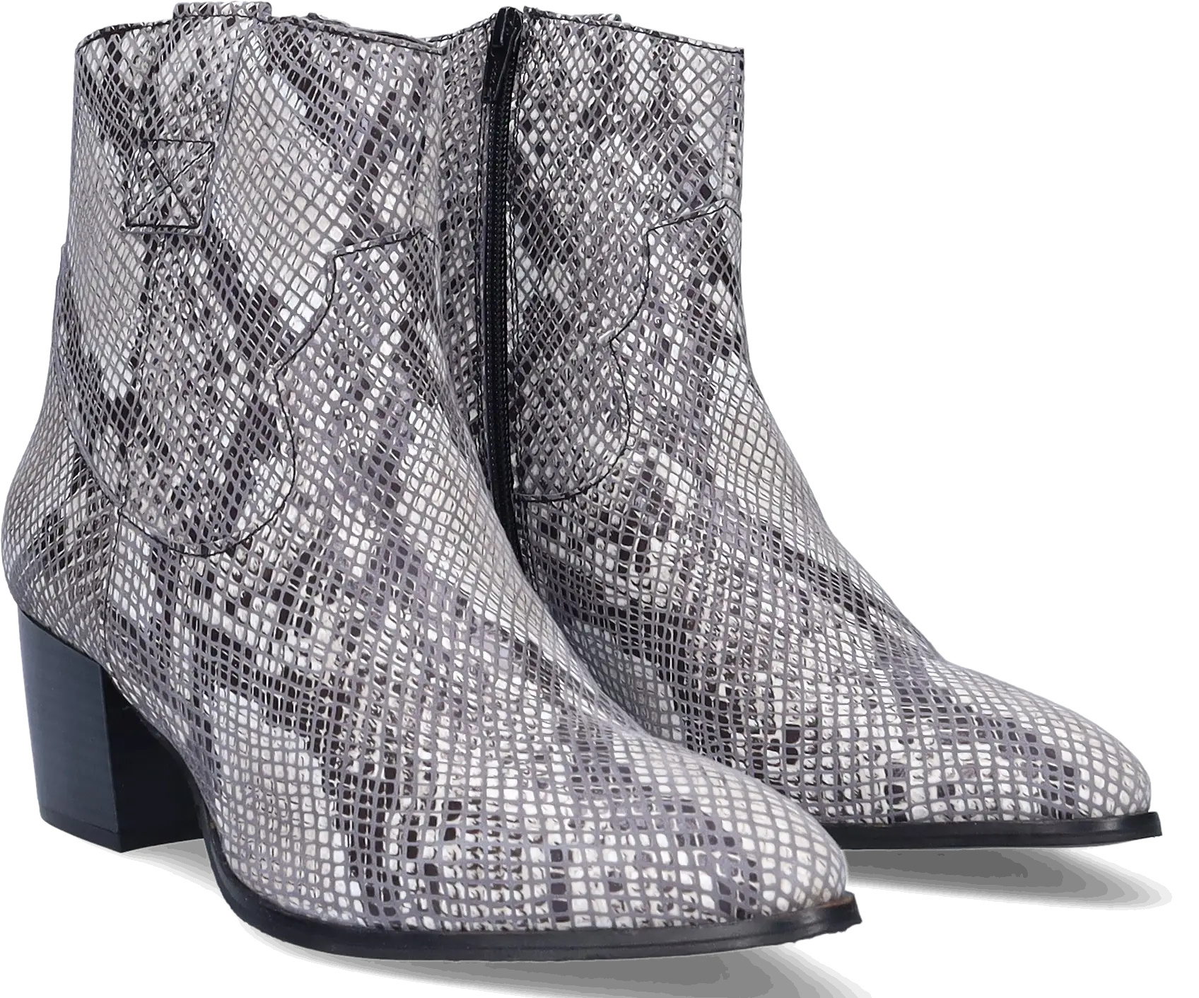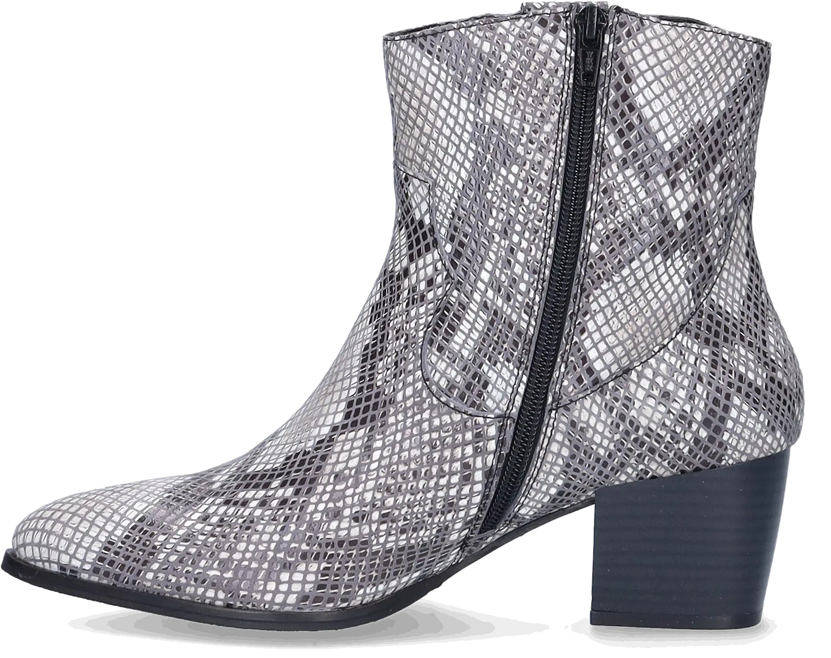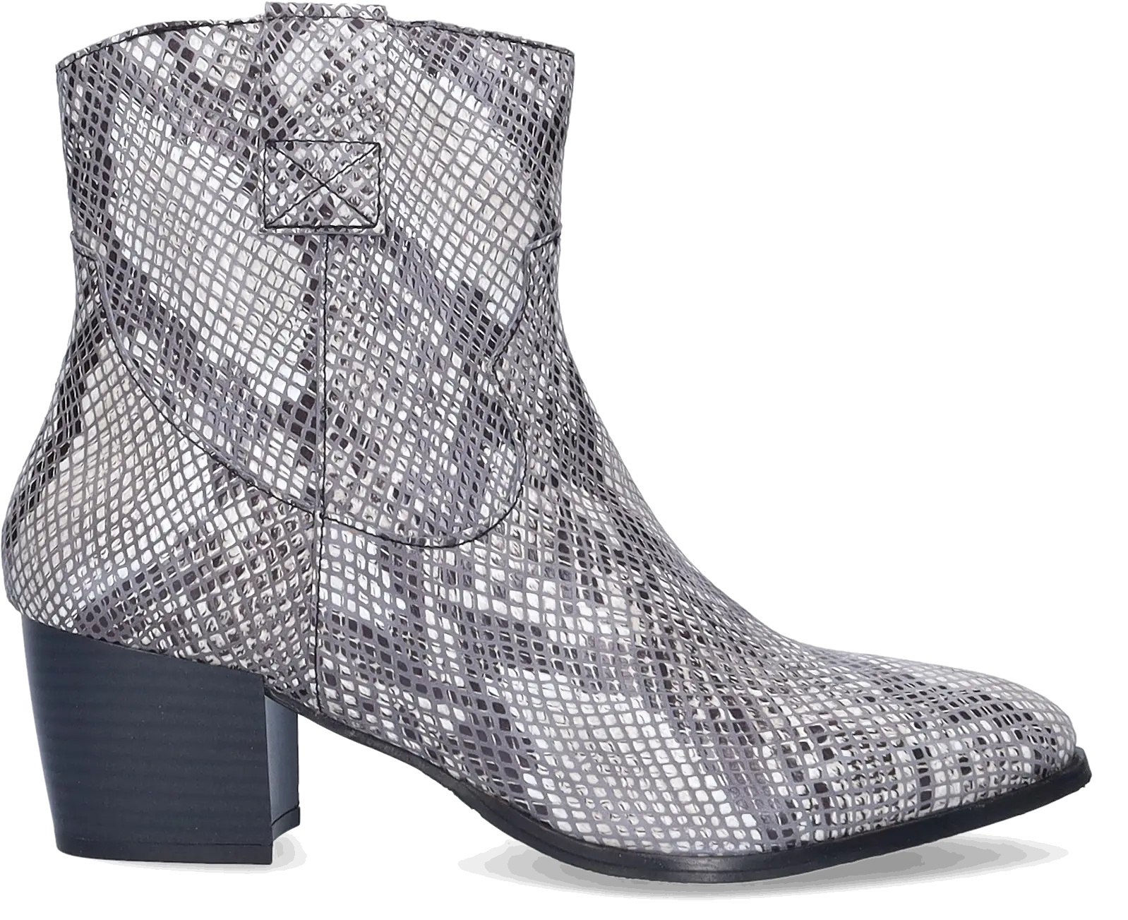 Epirus is a striking black and white wide width ankle boot crafted from faux snakeskin and leather. Designed for comfort, it features a wide width, a convenient side zipper, a generous fit around the ankle, and a spacious footbed. This boot boasts a chic pointed toe and a stylish Cuban heel.