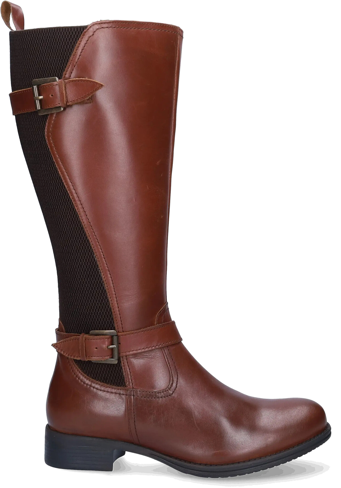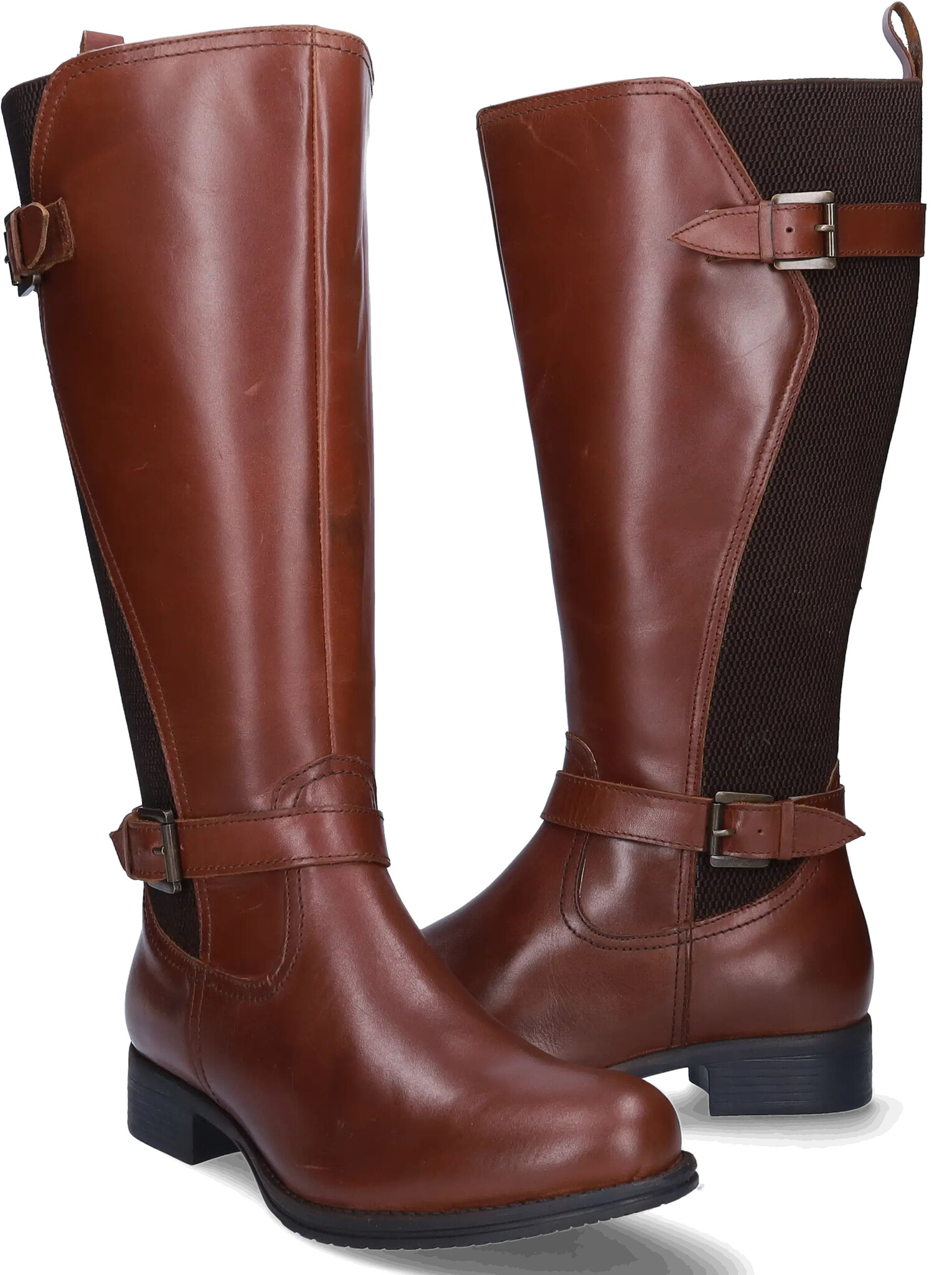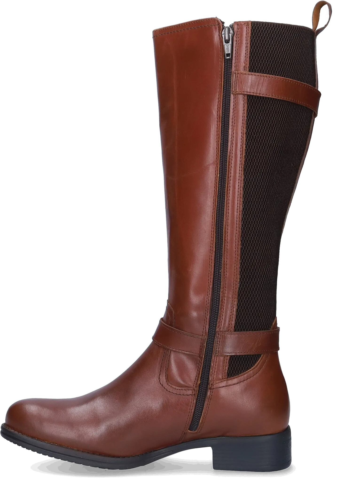 Redbourn in cognac is an extra-wide calf boot. It features enhanced comfort and support thanks to elastic stretch material at the back. This boot features sturdy buckles, a heel, a zipper closure, a flexible non-slip sole, and a replaceable insole.