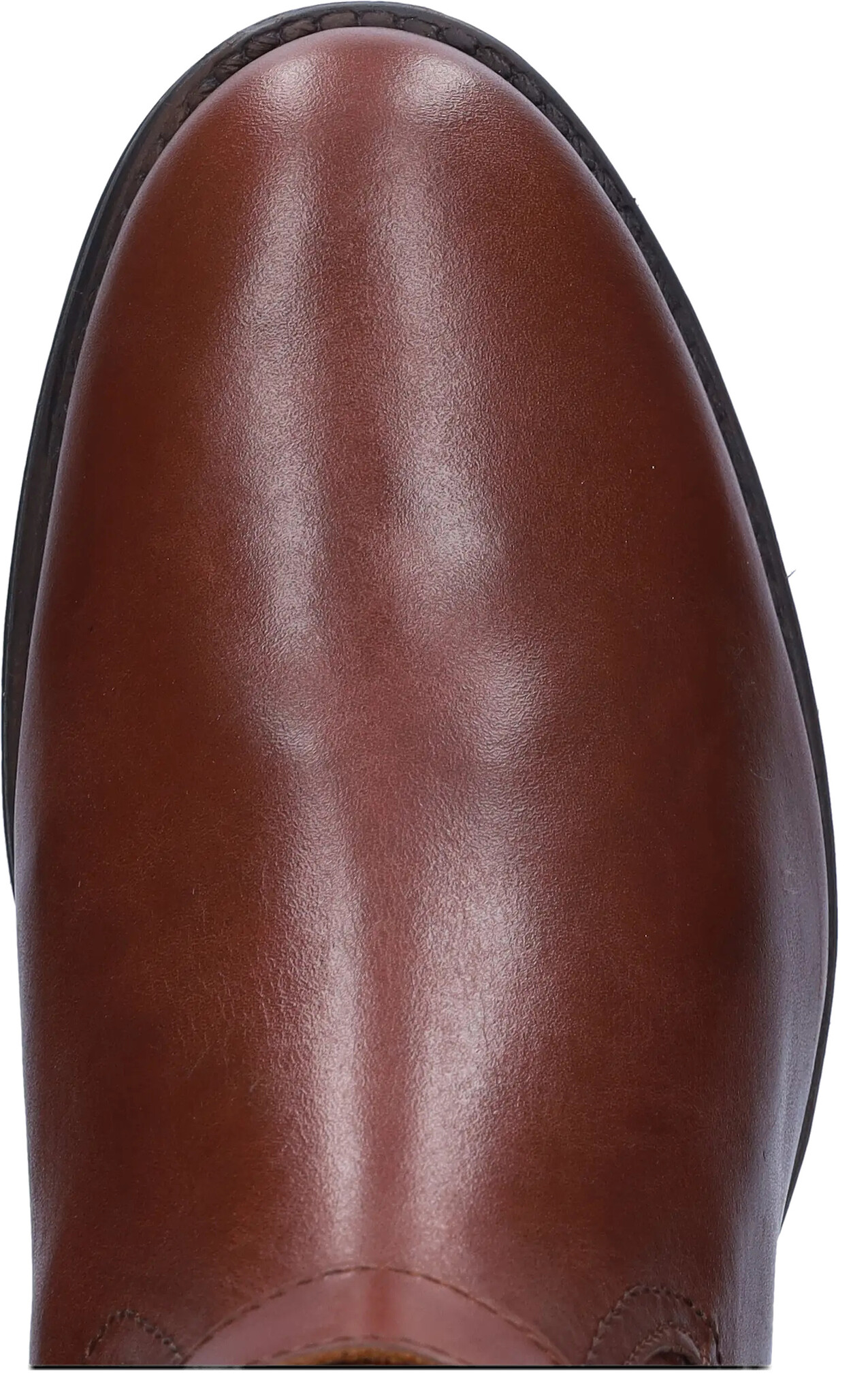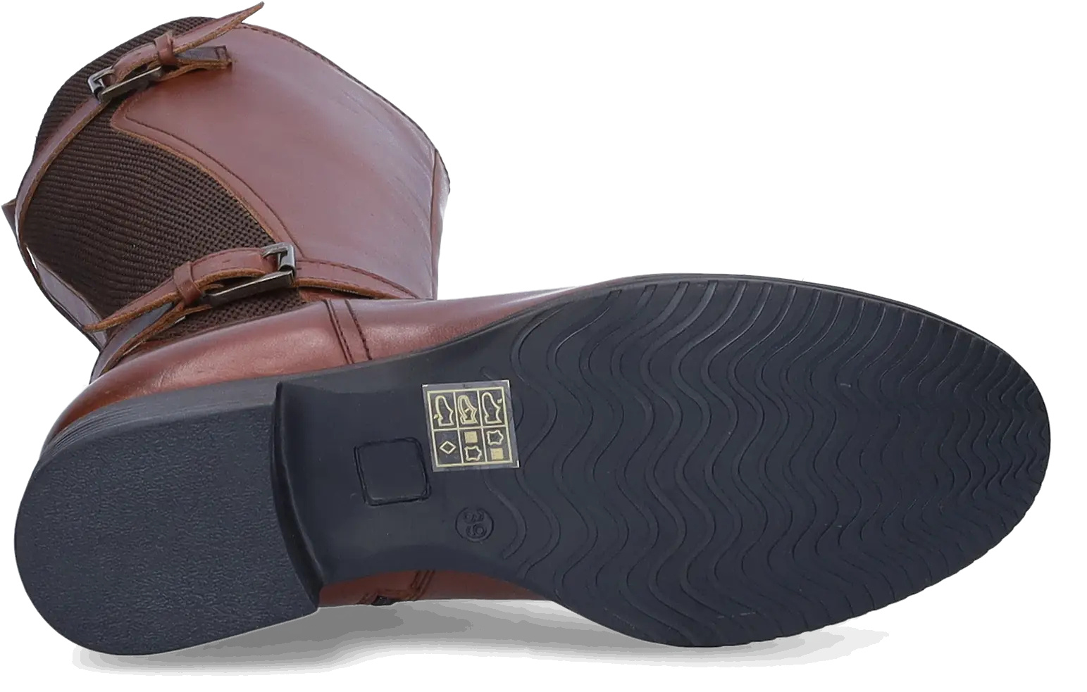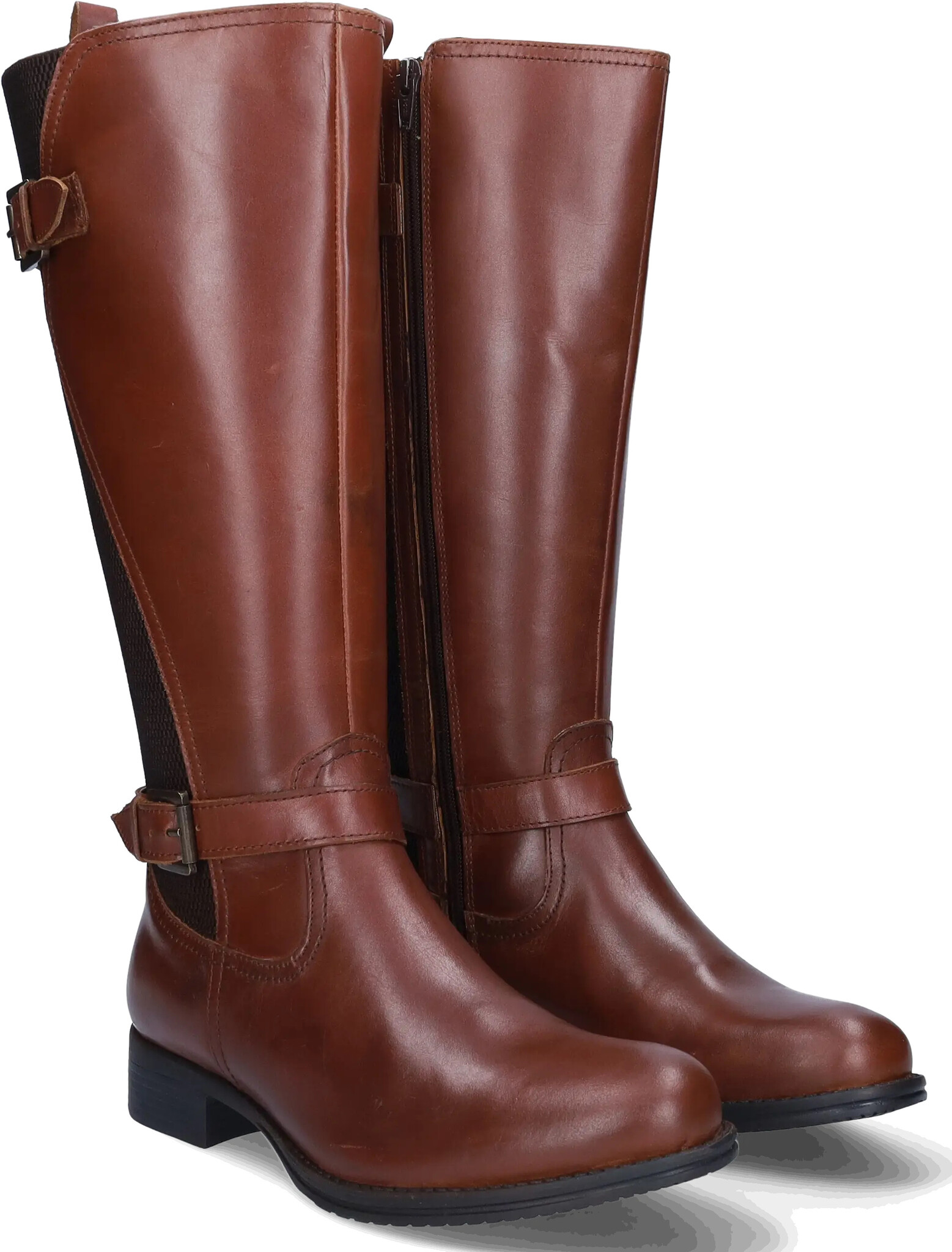 Redbourn in cognac is an extra-wide calf boot. It features enhanced comfort and support thanks to elastic stretch material at the back. This boot features sturdy buckles, a heel, a zipper closure, a flexible non-slip sole, and a replaceable insole.