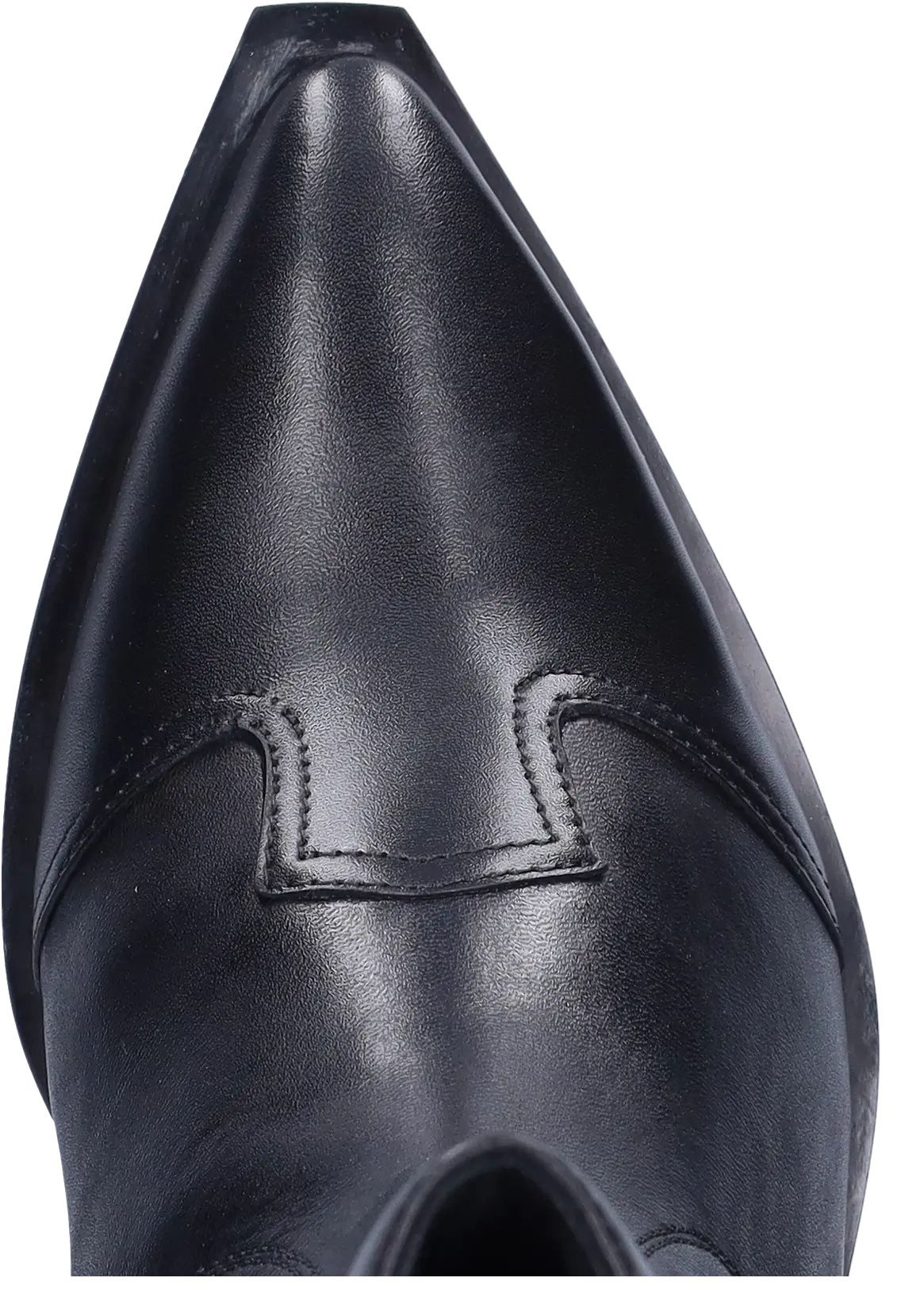Ripley is a black, wide-width leather ankle boot with a cowboy-style design. It features a side zipper and a Cuban heel, and is suitable for orthotics.